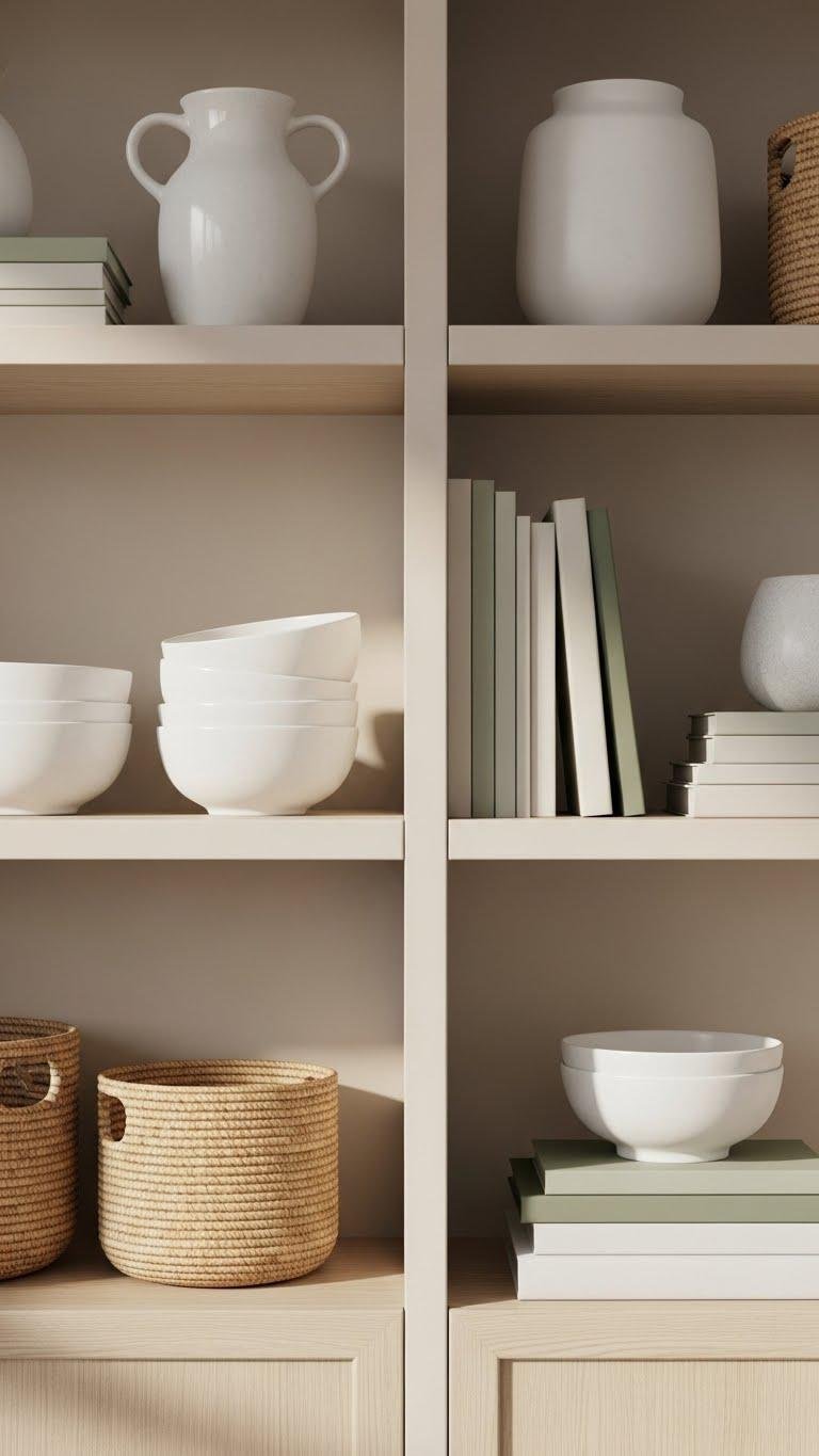 Edit your open shelving to a simple color palette, mix airy ceramics, baskets and slim books, and leave breathing room.