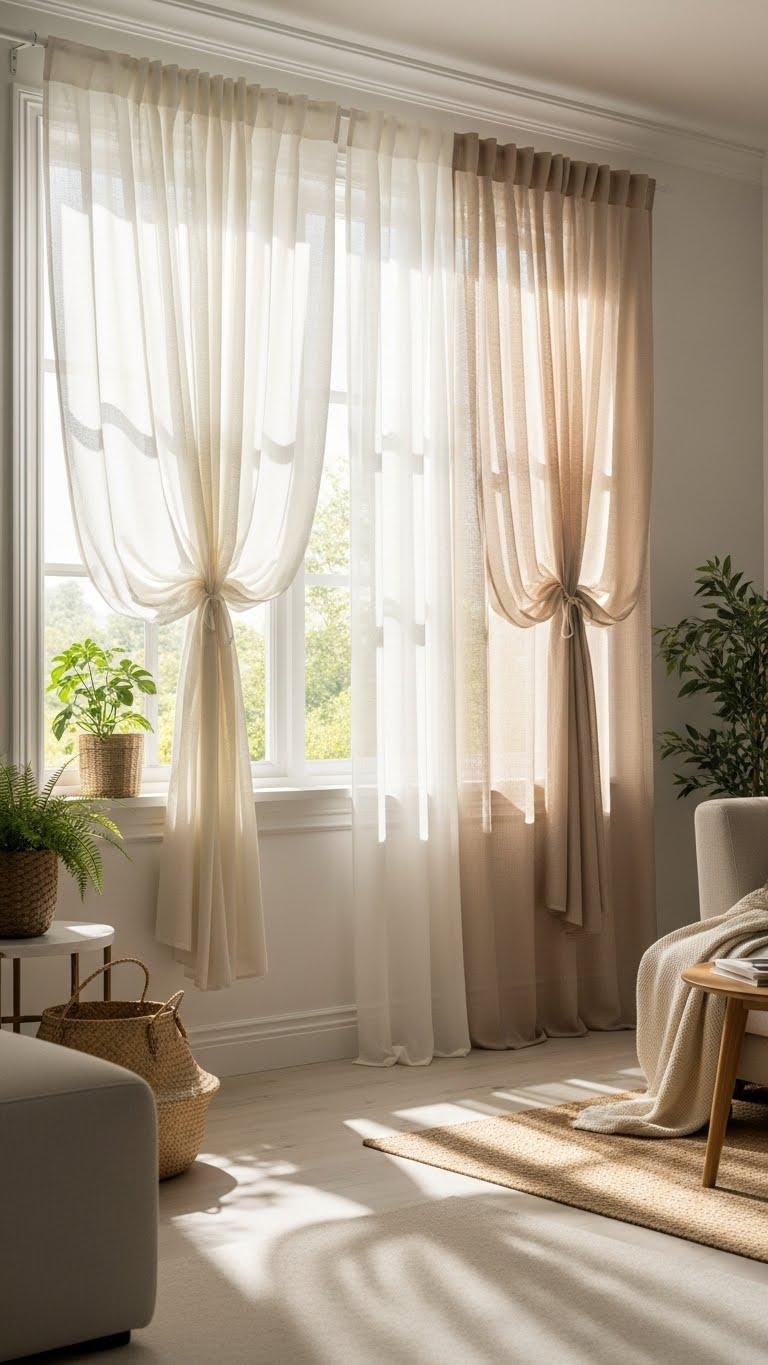 If you want brighter, airier rooms without losing privacy, swap heavy drapes for sheer or lightweight panels that filter light and soften the view. Choose airy sheer paneling in neutral tones, hang slightly higher for visual height, and secure with breathable linen tiebacks for a relaxed, elegant vibe. You’ll enjoy a freer, breezier space that’s low-effort and totally on-trend.