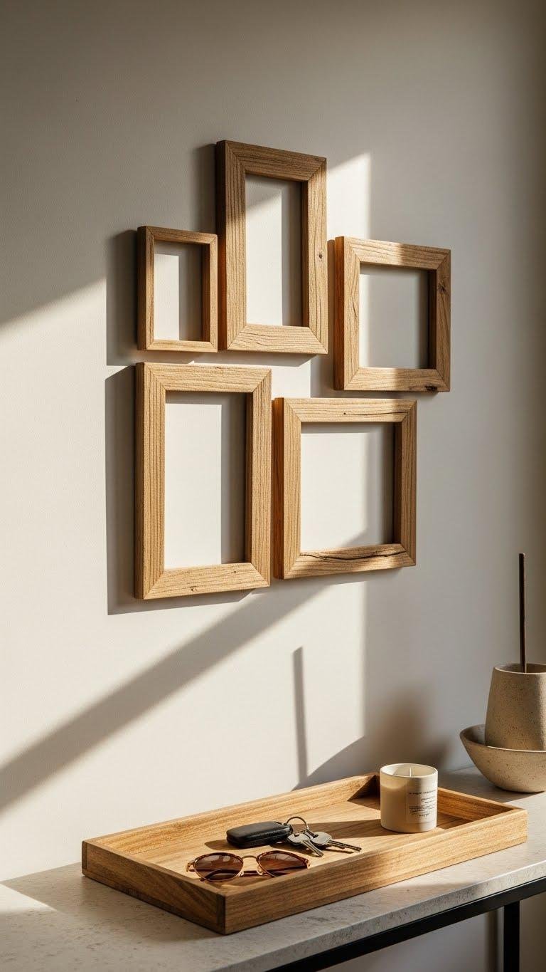 You’ve lightened entryway textiles; now bring that same airy feeling into your décor by swapping metal or glossy frames for natural wood picture frames and adding wooden trays. Choose reclaimed frames for character and sustainability, hung casually or clustered.