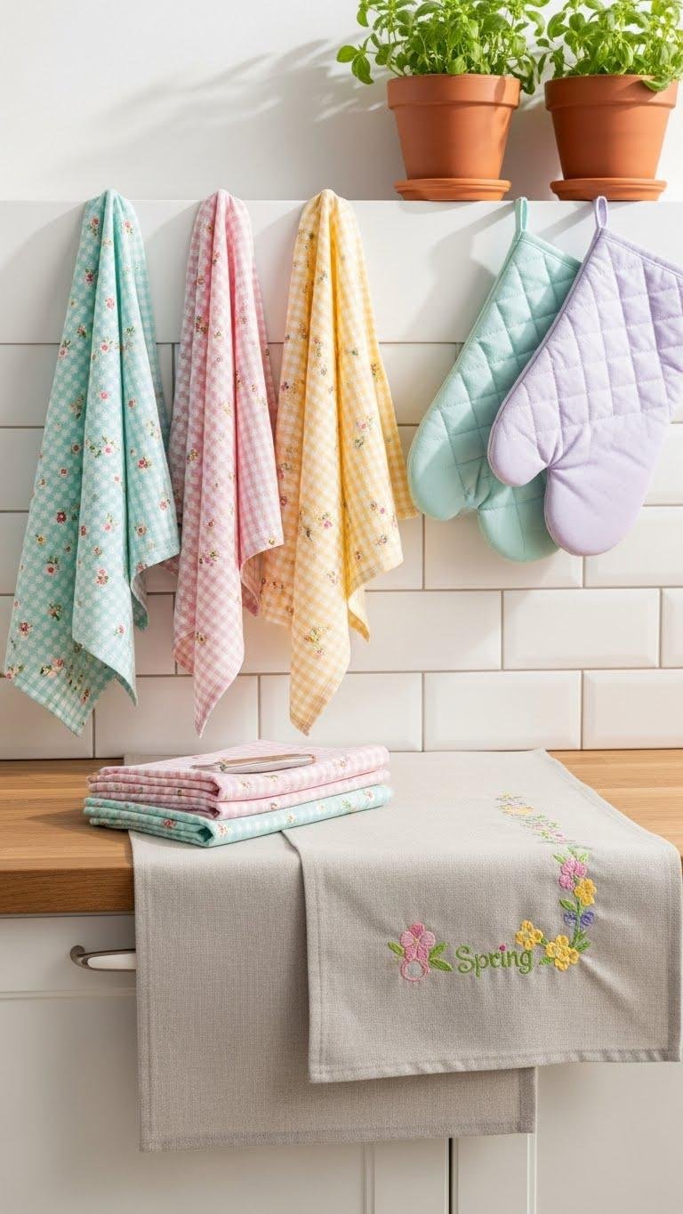Swap out heavy, dark kitchen textiles for linens in fresh spring hues to instantly lift the room’s mood. Choose tea towels, table runners and oven mitts in pastel patterns that feel airy and modern. You’ll mix solids with small prints, add spring themed embroidery for subtle charm, and replace worn pieces quickly — an easy, low-commitment way to refresh your kitchen vibe.