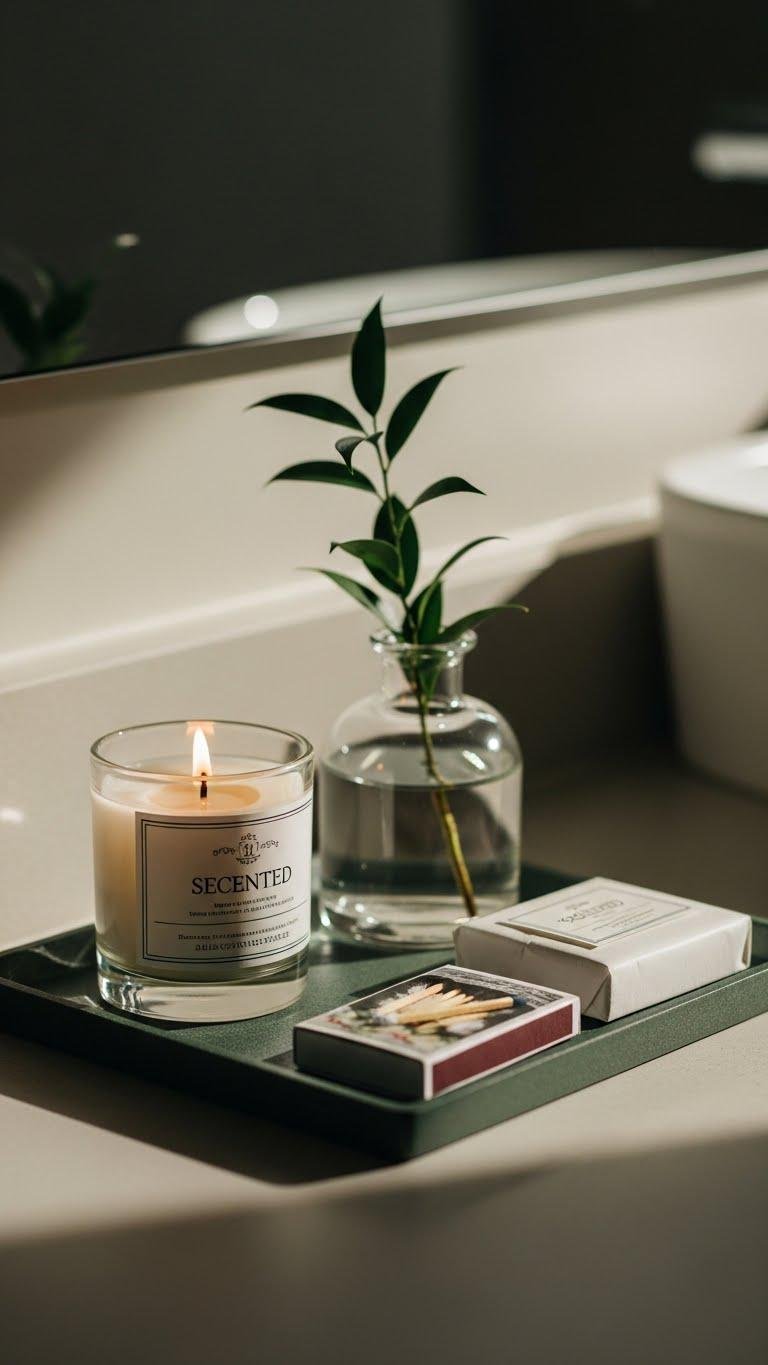 After renewing towels, give a small tray a simple styling to carry that calm, hotel-like feel through the room. Pick a low-profile candle in scented wax, a short vase or mini terrarium with a single greenery sprig, and one useful object—matches or a small soap. You’ll create a curated, relaxed vignette that feels effortless and freeing.