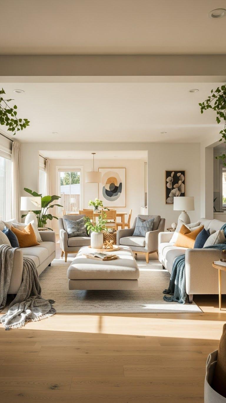 Move sofas away from walls, position angled chairs to spark conversation, and use floating ottomans to define zones without blocking flow. You’ll gain flexible sightlines, better traffic paths, and a lighter, freer space that invites movement and spontaneous living.
