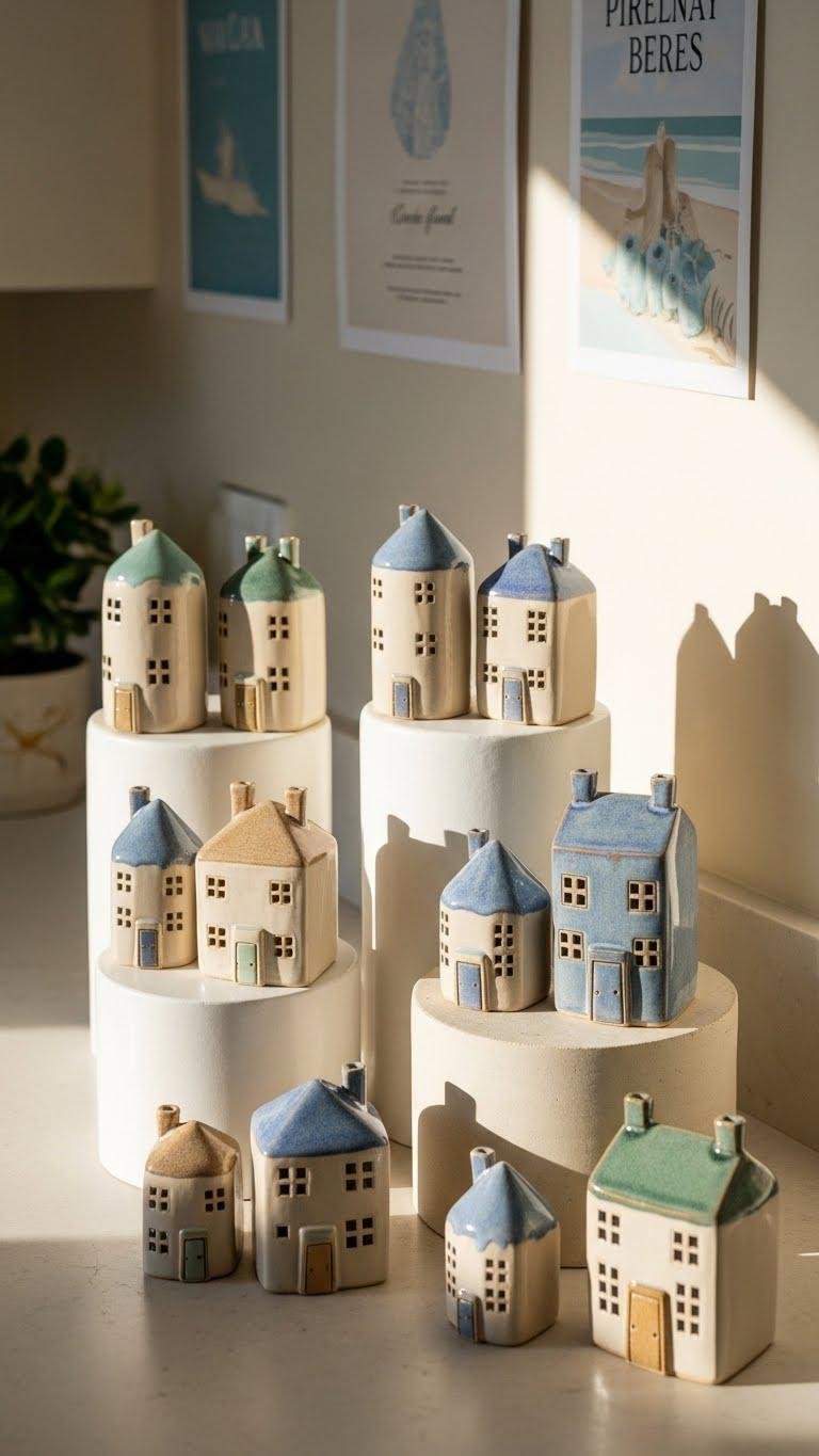 After you’ve warmed the wall with coastal prints, add small sculptural charm by clustering handmade ceramic houses on pedestals to give your kitchen personality and depth. You’ll place miniature cottages in varied heights, creating breezy pedestal displays that lift eye level and invite touch. Keep colors soft, group odd numbers, and leave breathing room so each piece feels free and intentional.