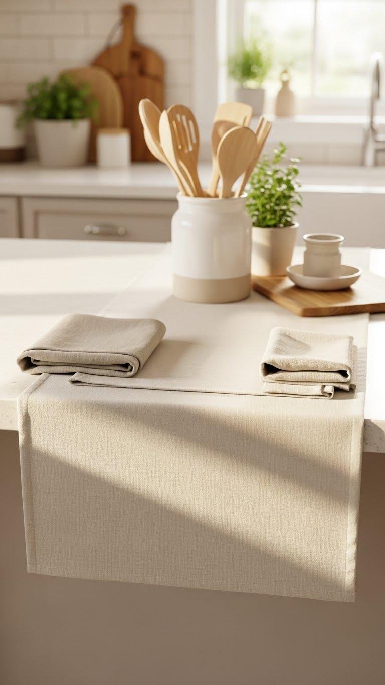 You’ll place a linen runner down to define zones, corral daily essentials, and keep minimal clutter visible but tidy. Choose soft neutrals that reflect light, fold edges neatly, and swap pieces seasonally. It’s a simple, freeing way to keep the kitchen airy and under control.