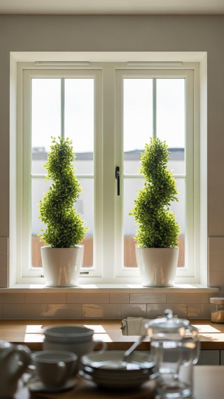 Frame your window with a pair of neat topiaries to add crisp, structured greenery that still feels fresh and springlike. You’ll love the symmetry and calm they bring; choose pots that echo your kitchen’s tone.