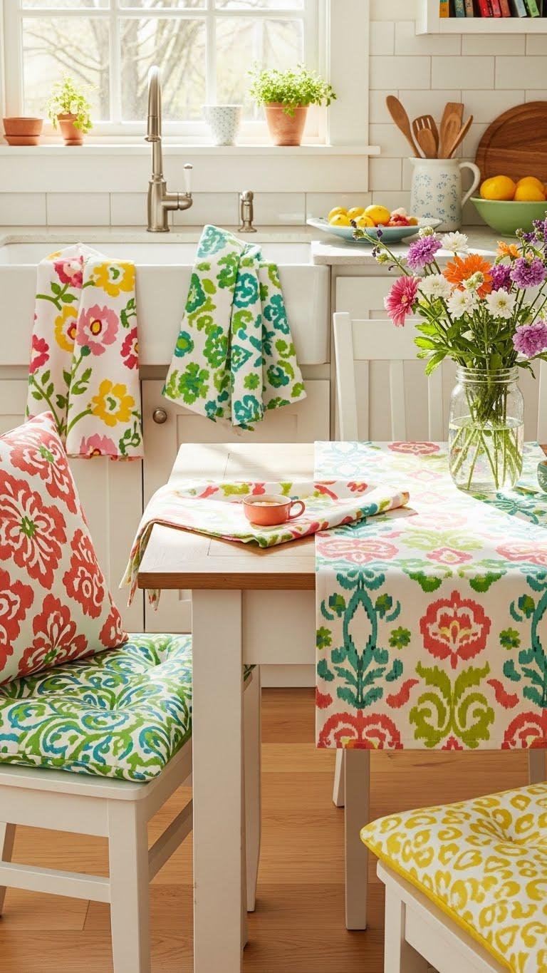 A few bold patterned textiles in vibrant spring colors can instantly lift your kitchen, adding personality and warmth without a reno.