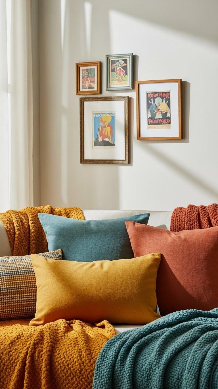 After adding bold textiles to soften the room, bring the walls into the mix with small vintage posters in budget frames that echo your new color palette.
