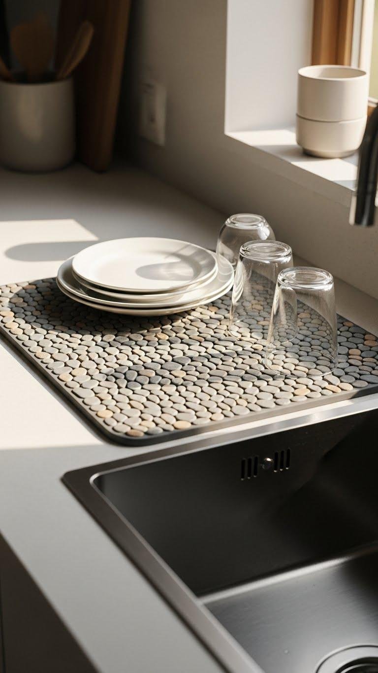 You’ll enjoy a stone mat with absorbent texture and a calming pebble pattern that supports minimalist drying. Place it near the sink, let dishes air freely, and relish clutter-free surfaces that feel open and intentional.