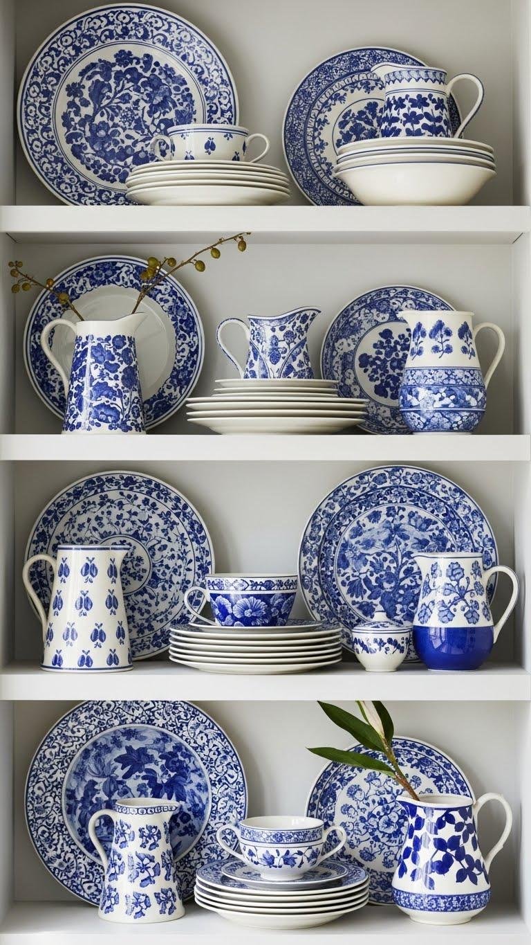 If you like the relaxed, collected feel of mismatched pitchers and natural stems, try echoing that casual layering on open shelves with blue-and-white platters. You’ll enjoy layered texture as you lean varying sizes and patterns, creating motion and ease.