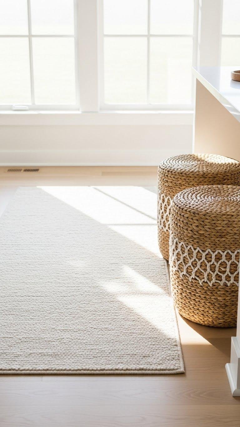 Tuck woven stools beside a light-toned rug to add texture and warmth without weighing down the space; the natural fibers of the stools contrast the soft, pale rug and create an inviting spot for a quick cup of coffee or an extra seat at the island.