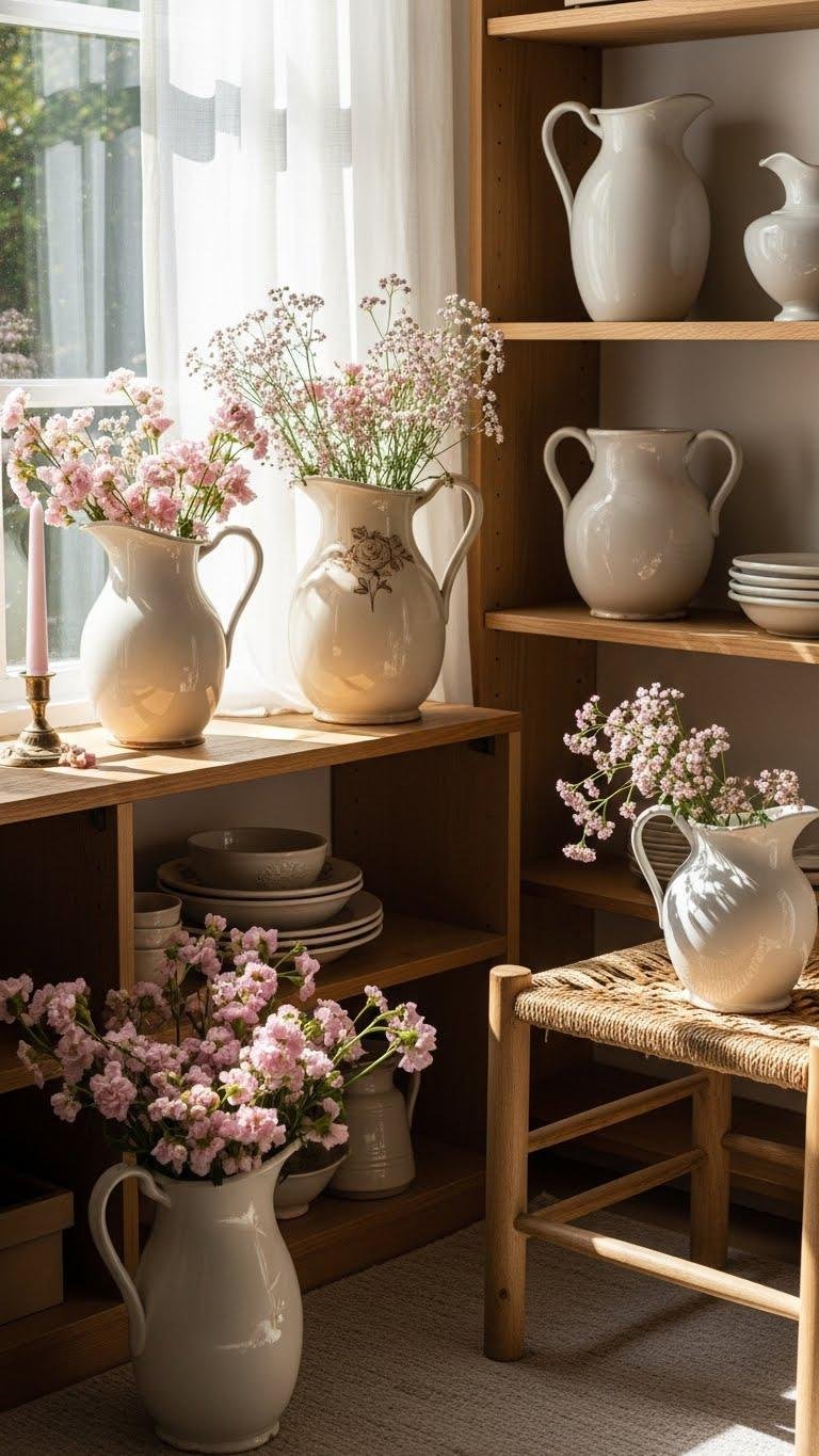 After you’ve warmed the corner with woven stools and a pale rug, bring in vintage pitchers filled with pale pink blooms to add soft, romantic contrast. You’ll pick pieces with antique glaze for texture and wear, arranging soft florals loosely so stems breathe. Place pitchers on open shelves or a windowsill, letting light and breeze keep the look effortless and free.