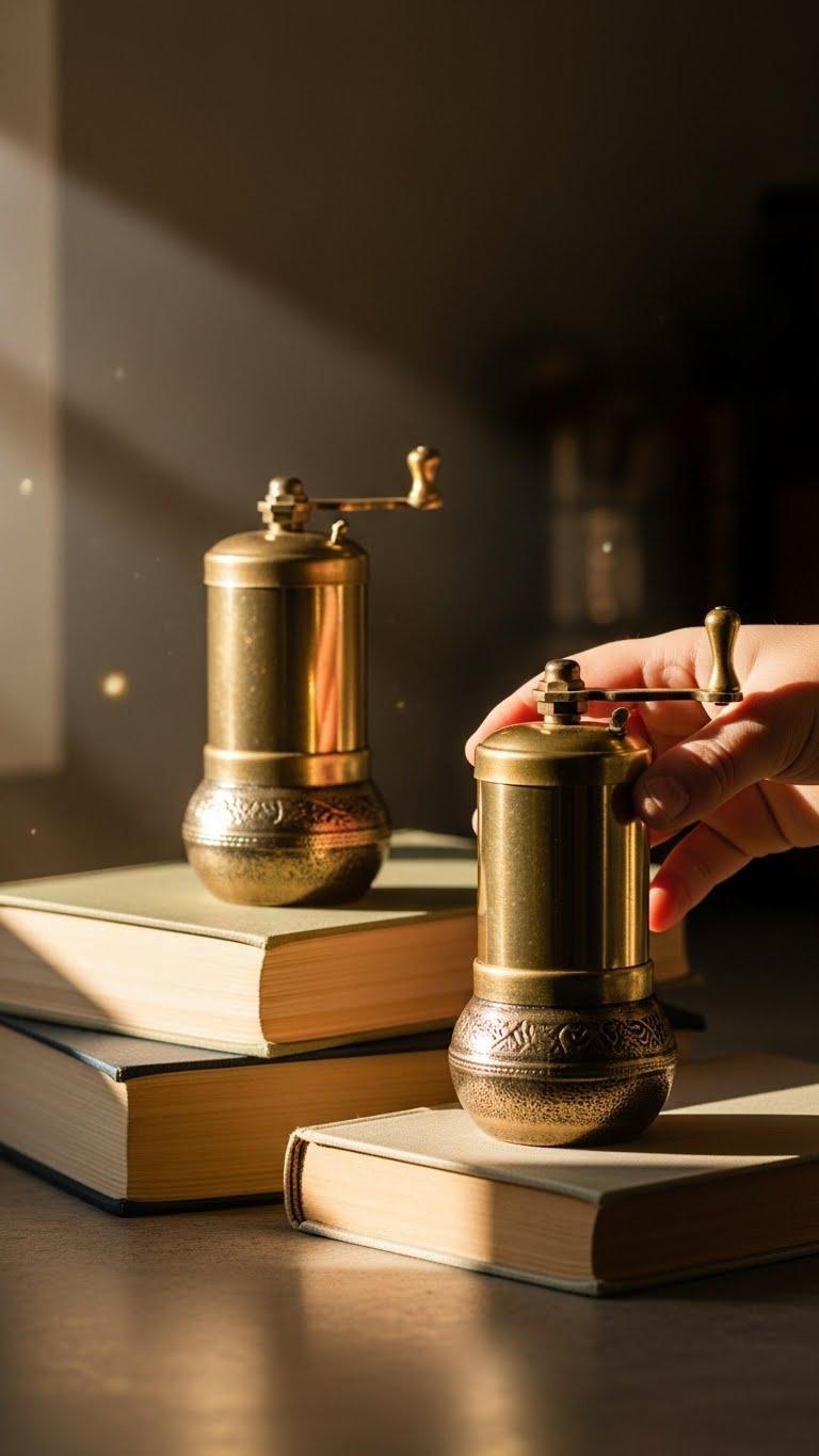After you’ve used books to build height and softness, let brass salt and pepper mills add a slick, polished counterpoint that catches the morning light.