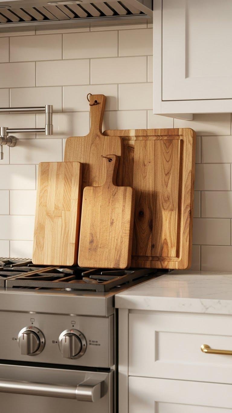 Often, you’ll lean a trio of wooden cutting boards of varying heights and grains against the backsplash behind your range, turning an underused strip of wall into a warm, functional backdrop.