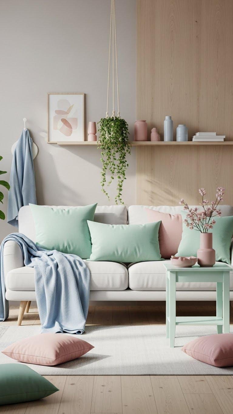 A soft pastel palette can instantly freshen your living room without overwhelming it; think muted mint, blush, and powder blue layered against warm neutrals.