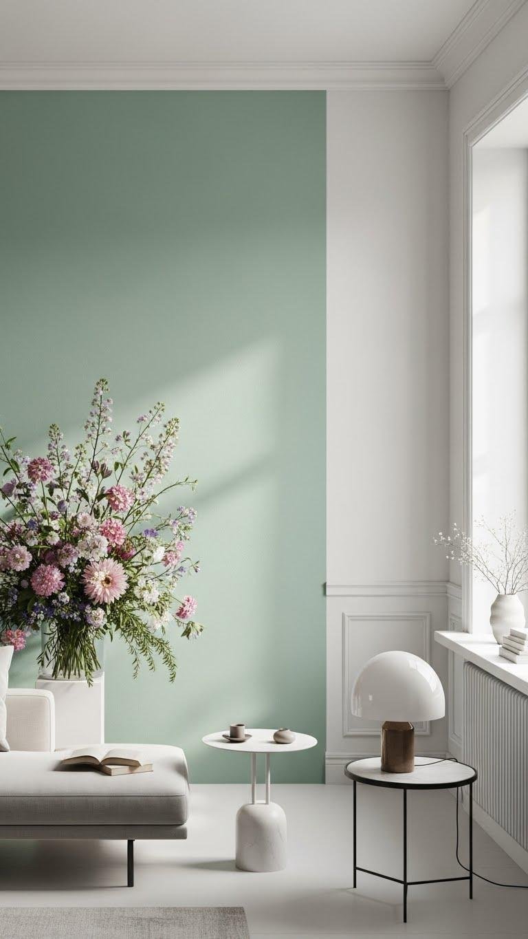 Pair that living, floral focal point with a calm backdrop by painting a single wall in sage or sky blue to anchor the space and amplify spring’s fresh vibes. Choose a matte finish for subtle depth, letting textures and light breathe. Keep surrounding walls neutral, use crisp trim contrast to define edges, and let furniture remain minimal so the hue feels liberated, not loud.