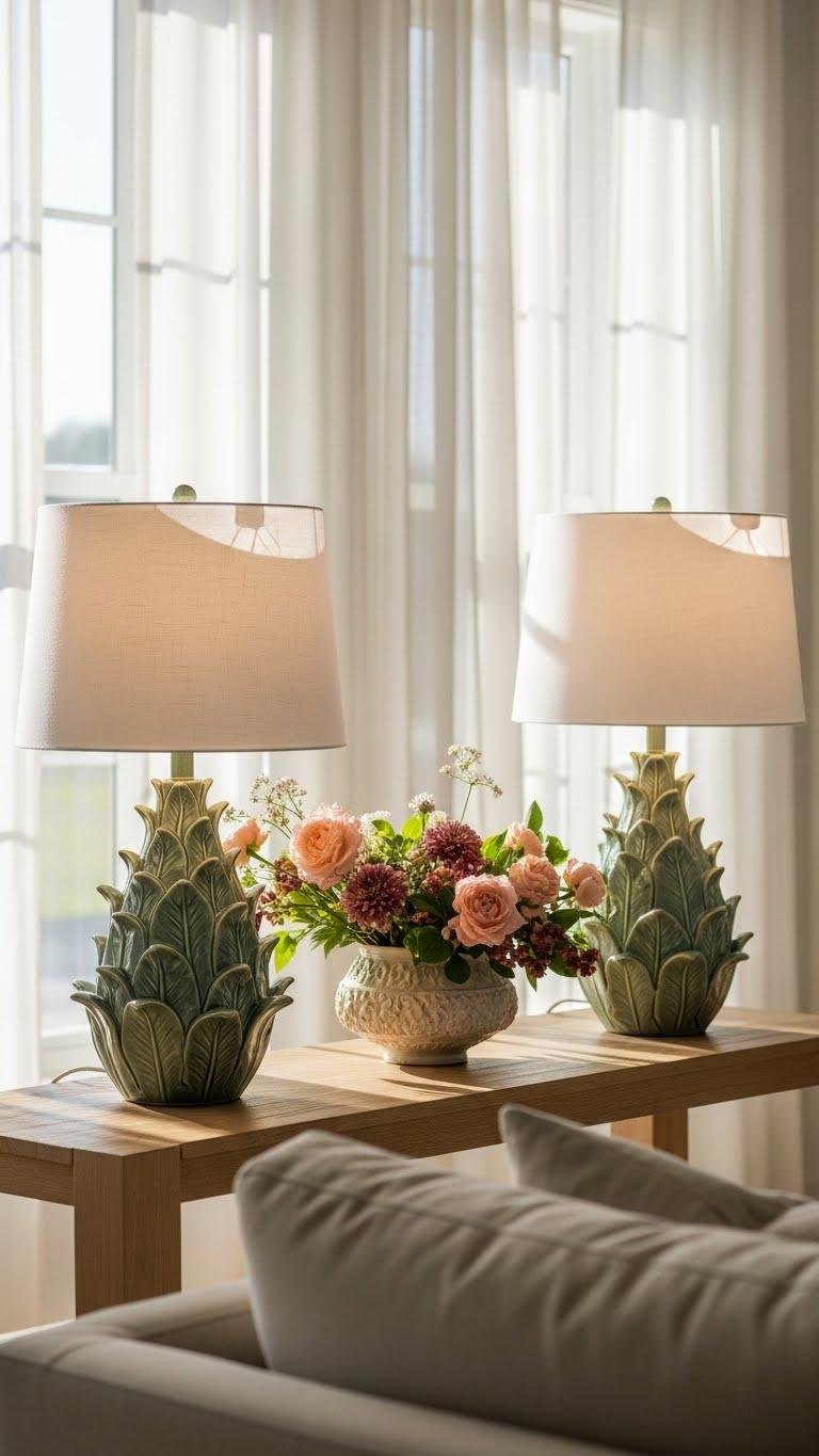 Keep the mood soft by choosing ceramic lamps with leafy bases that echo your floral focal point and reinforce spring’s organic feel. You’ll pick pieces with textured bases and subtle botanical motifs to add sculptural interest without clutter. Place lamps to liberate corners, balance light, and highlight foliage. Choose matte glazes and airy shades so your room feels effortless, fresh, and open.