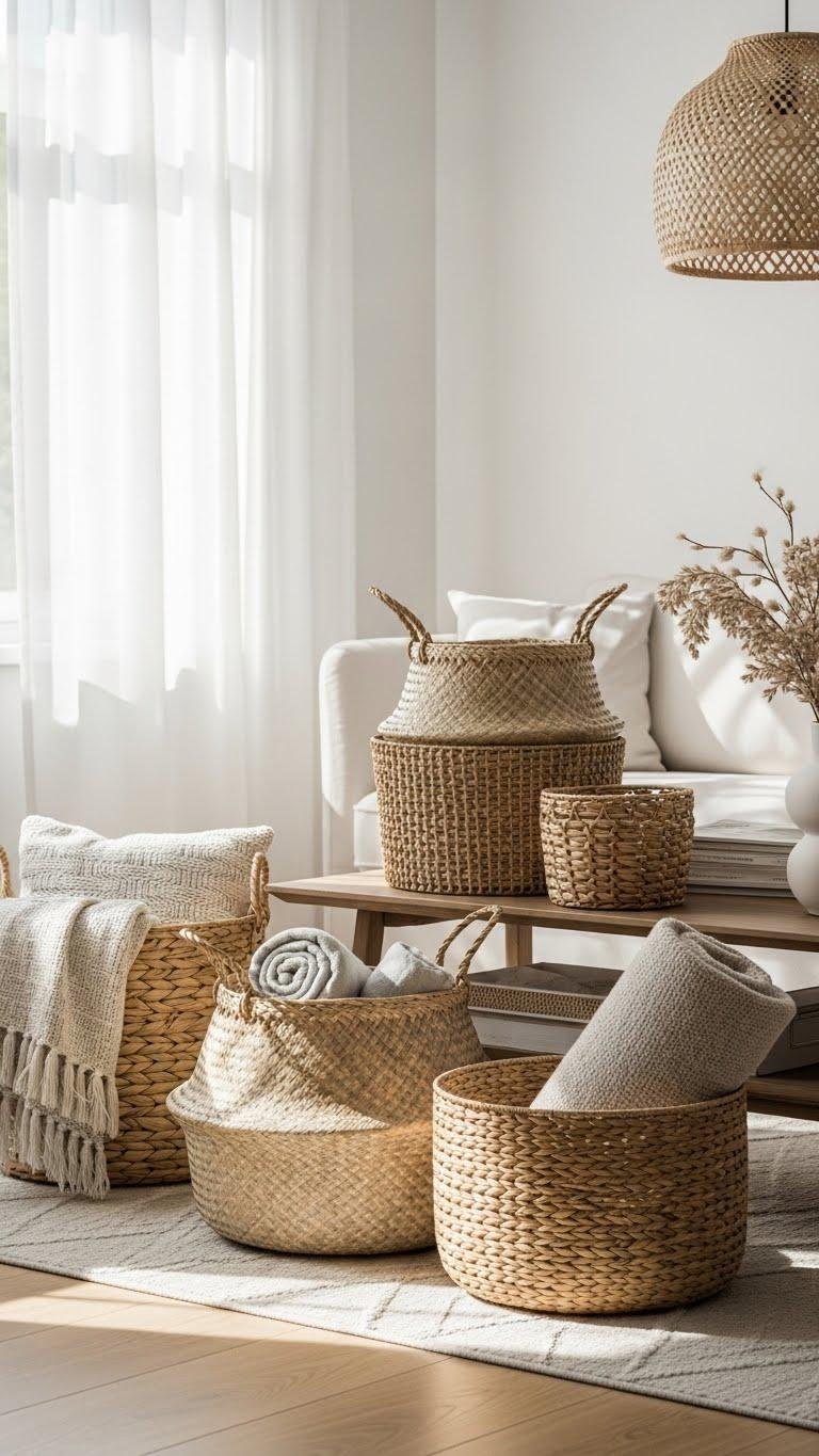 Often, you’ll rely on woven baskets to introduce tactile contrast and effortless storage into your spring living room. Use varied sizes and materials for woven texture that anchors airy palettes. You’ll tuck throws, magazines, or a cozy blanket inside, practicing subtle basket layering on floors and low tables. The result feels liberated, organized, and intentionally relaxed without cluttering your free-flowing space.