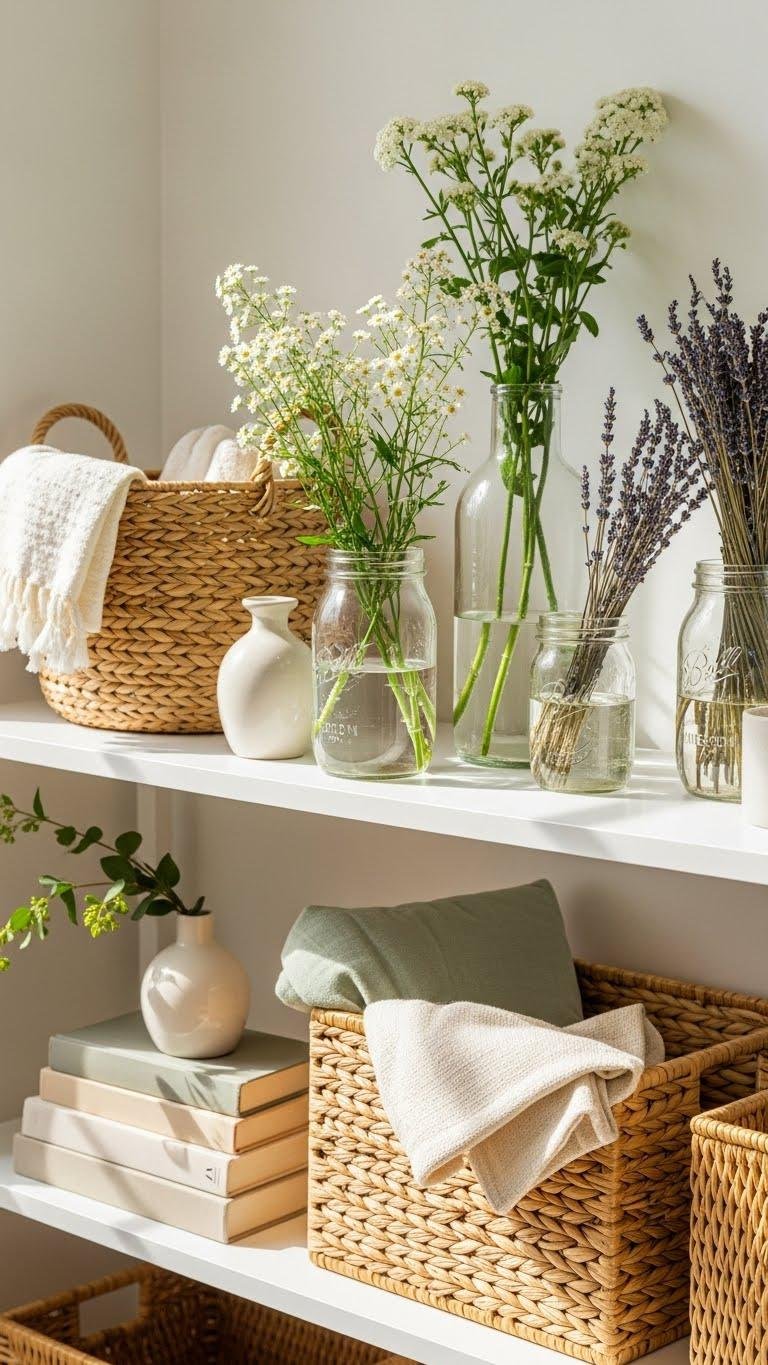 Move a few of those woven baskets’ cozy accents onto your shelves and let seasonal blooms lift the room.