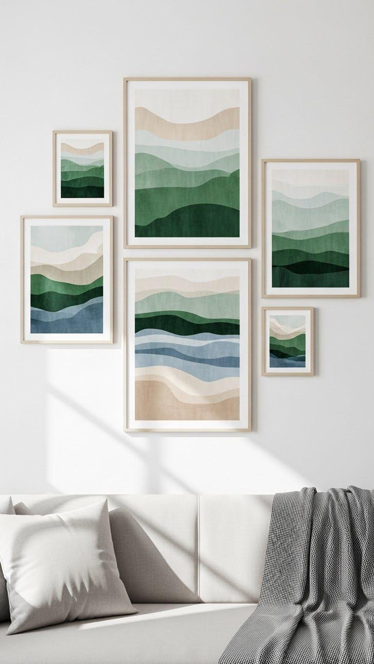 Lift your walls with abstract nature-inspired prints that nod to the outdoors without literal depiction — think layered washes of verdant greens, sandy neutrals, and airy blues that read as mood rather than map. You’ll choose pieces with organic shapes and soft tonal gradients to anchor seating, create airflow, and invite calm.