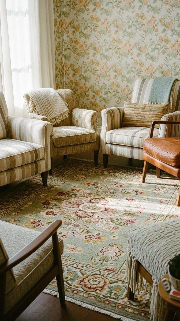 Complement those airy, nature-inspired prints with a vintage floral rug that grounds the room while echoing its soft palette. Choose faded blooms and layered textures to balance retro wallpaper without competing. Let the rug tie mismatched armchairs into a cohesive mix; play with scale and color, and you’ll create a liberated, lived-in space that feels curated, relaxed, and unmistakably yours.