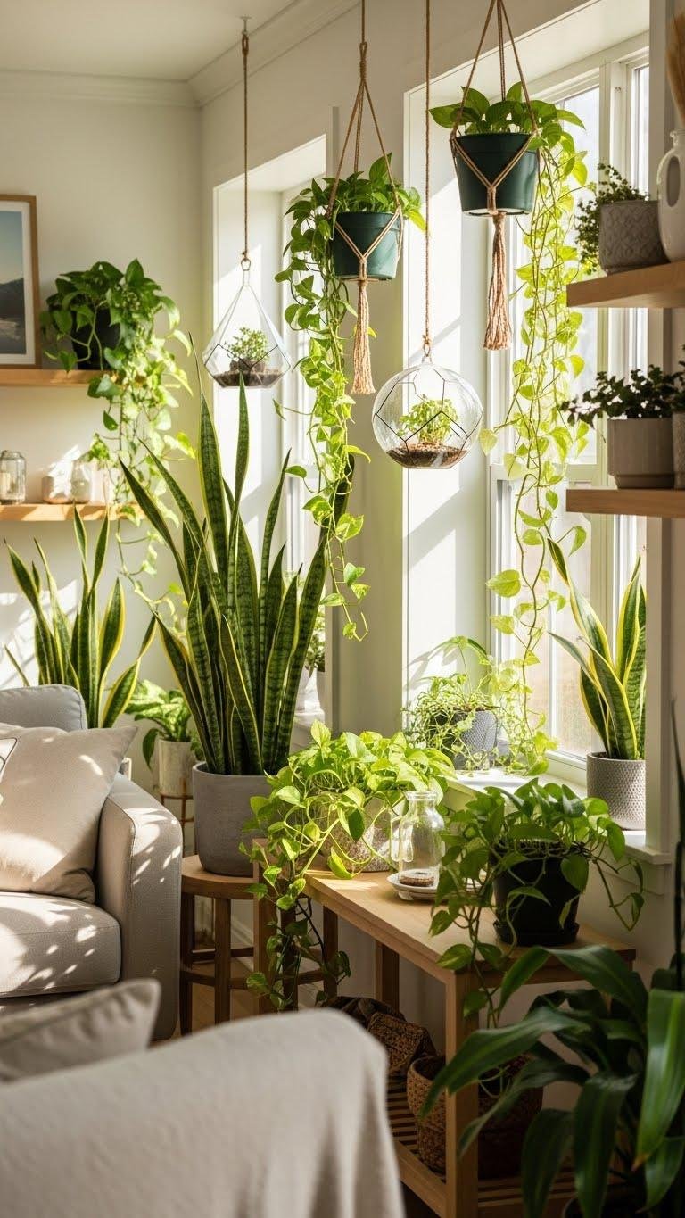 Often, you’ll find that bringing fresh plants into every corner of the living room instantly lifts the mood and improves air quality. You’ll choose air purifying species—snake plants, pothos—and place them confidently on shelves, consoles, and window sills. Add hanging terrariums for sculptural interest and mobile greens. You’ll enjoy cleaner air, calmer energy, and a liberated, breathable space.