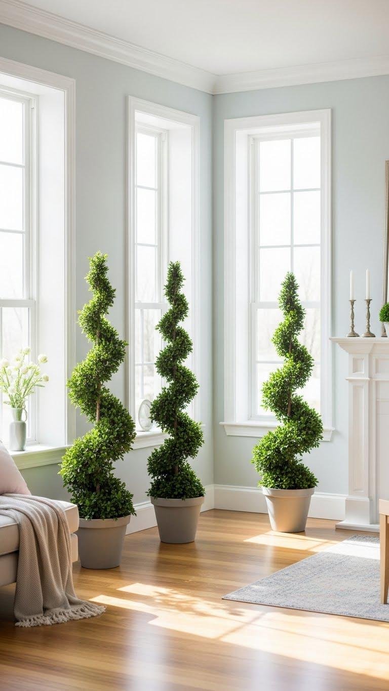 When you introduce sculpted topiaries, they bring instant vertical drama and a tidy sense of structure to a spring living room.