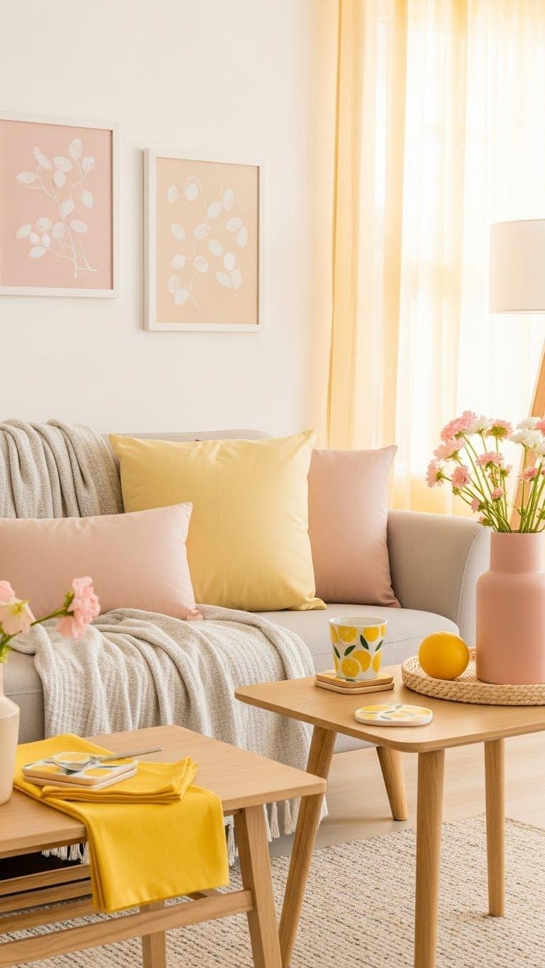 Choose throw pillows, a soft throw, and art with pale tones. Add sunny napkins on a side table and citrus coasters by your sofa to keep things playful and practical.