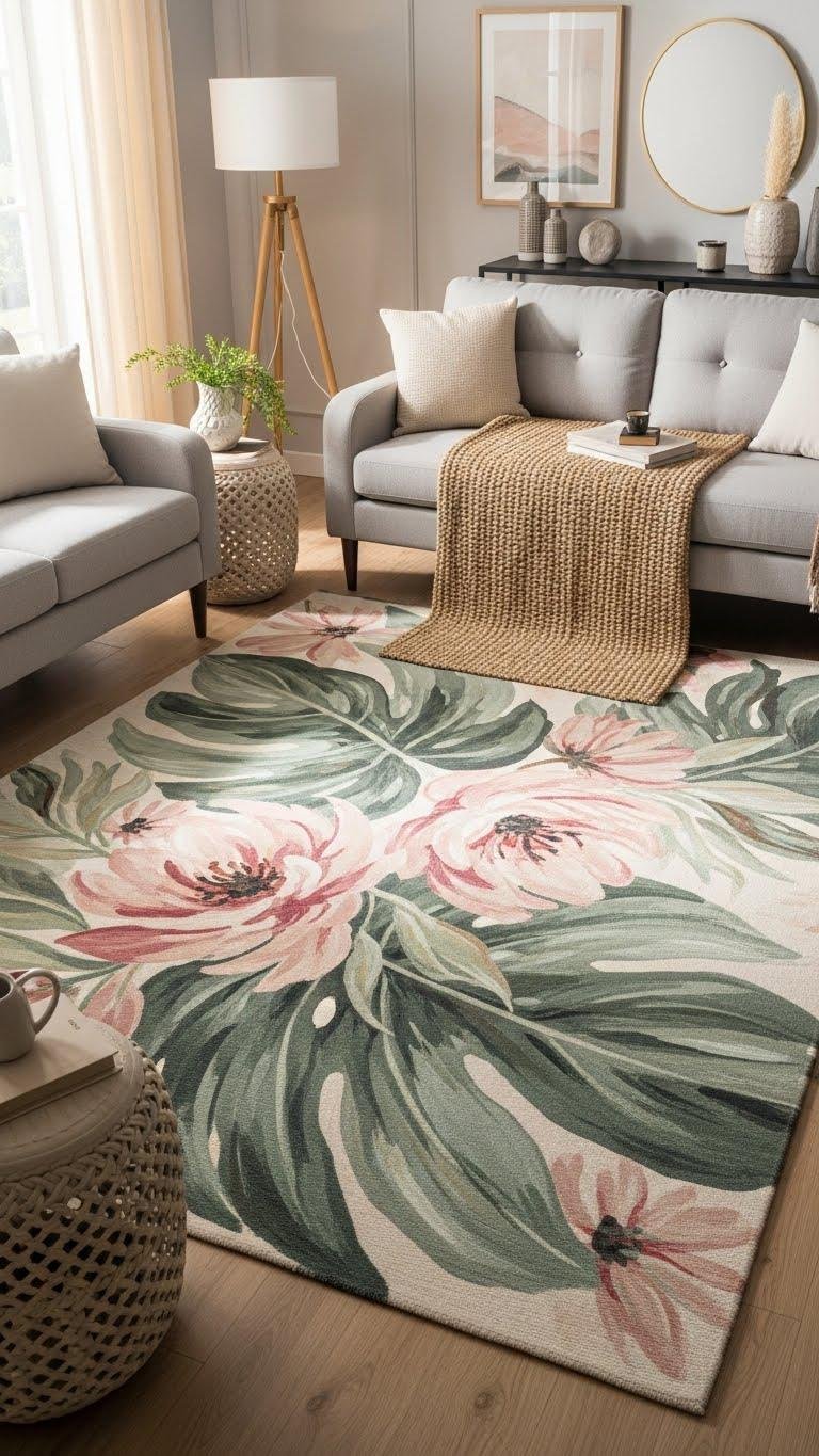 A bold botanical rug can anchor your spring scheme and instantly lift a neutral living room, so pick one with oversized leaves or painterly florals in muted greens and soft pinks to echo your accents.