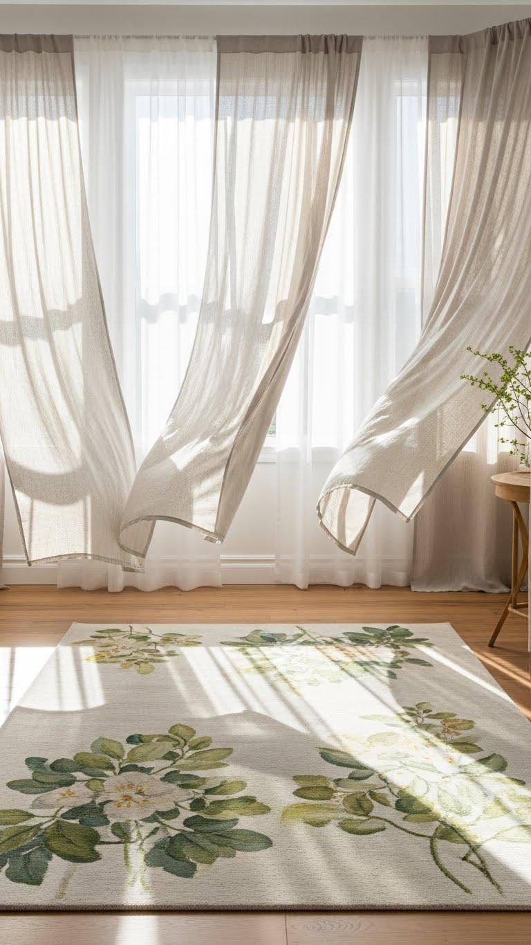 Now that your room centers on a light, painterly botanical rug, lighten the window treatments to match. Swap heavy drapes for linen valances and breezy voile swags that filter light while freeing space. You’ll invite air, movement, and a casual elegance that feels effortless. Choose soft neutrals or pale greens to echo the rug and keep the room open, calm, and liberated.