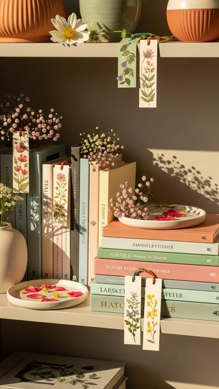 Ditch the stack of heavy coffee-table tomes and swap them out for lighter, floral-arranged stacks that instantly refresh a shelf’s vibe. You’ll pick slim, colorful volumes, tuck botanical bookmarks between pages, and nest bundles with pressed petals under a ceramic tray. Mix heights, leave negative space, and keep pieces movable so your shelving breathes — a liberating, styled approach you’ll actually maintain.