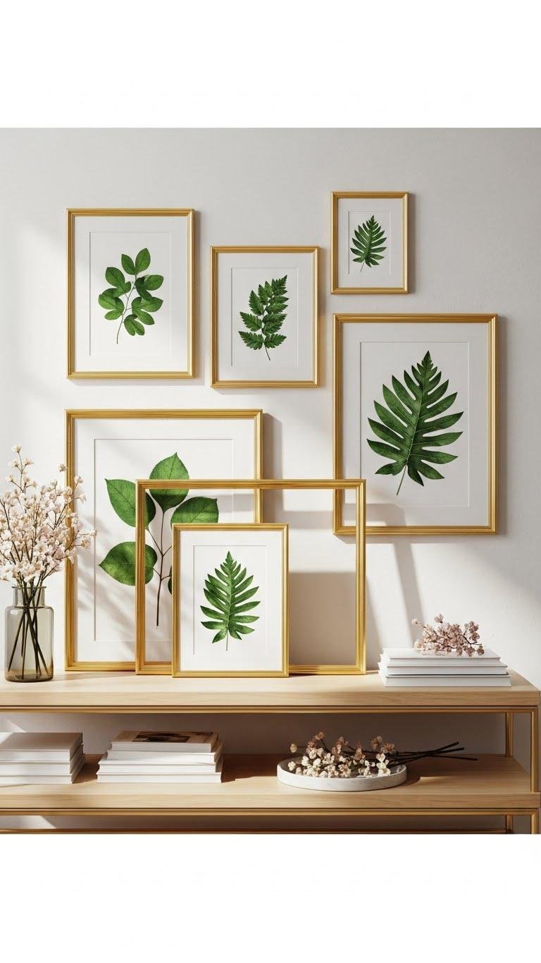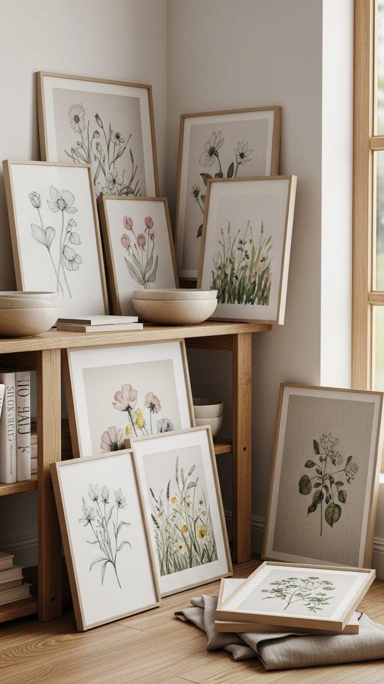 You’ll mix watercolor meadows with linen botanicals prints in simple frames, lean them casually, and rotate sizes for a breezy, curated feel.