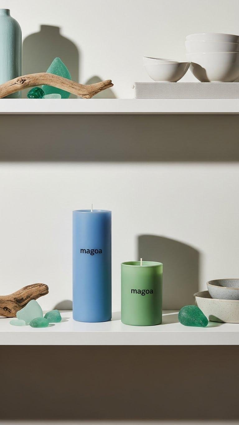 Anchor your shelf arrangements with blue and green Magoa candles to create an immediate sense of calm and cohesion—place one taller candle and one shorter one to form an intentional vertical anchor, then surround them with low-profile items so the colors read as a deliberate palette rather than an afterthought. You’ll lean into coastal anchors, scented layering, and airy spacing to keep the vibe free and curated.