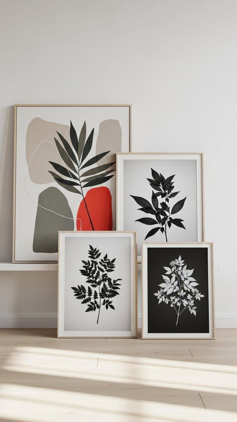 Pairing abstract nature prints with crisp botanical photos gives your shelf or wall an easy, modern contrast that feels both artful and approachable. You’ll mix abstract foliage canvases with high-contrast botanical silhouettes to create rhythm and calm. Float frames at varied heights, limit palette to two neutrals plus one accent, and let negative space breathe so each piece feels free, deliberate, and fresh.