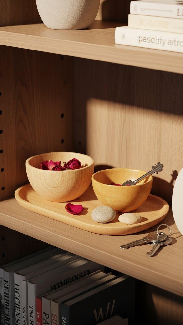 Tuck a small wooden bowl or tray into a corner of your shelf to anchor the space and add a warm, tactile counterpoint to smoother surfaces.