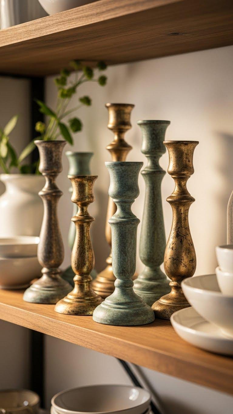 Elevate your shelf styling by clustering candlesticks finished with Rub ‘n Buff to give them that softly aged, heirloom look—mix heights and profiles so the metallic patina reads like a collected vignette rather than a matched set.