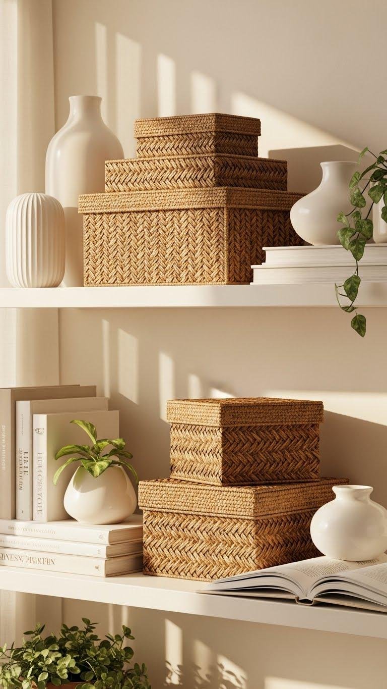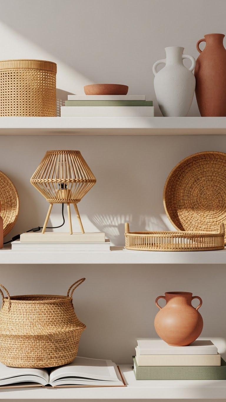 Adding rattan pieces lets you introduce warm, tactile texture without overwhelming a shelf — their woven patterns catch the light and add an artisan touch that feels both modern and timeless.