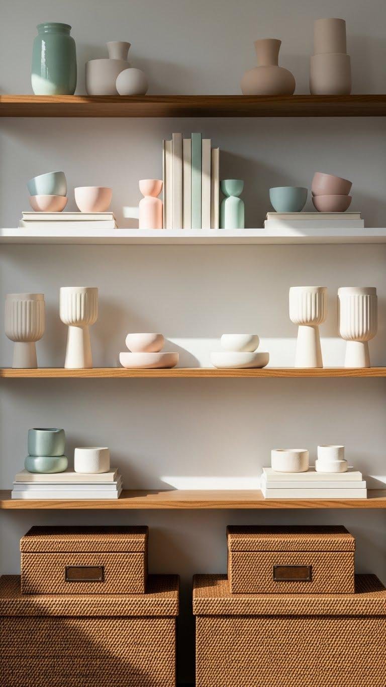Pair those zigzag brown woven boxes with lighter pieces on the top shelves to keep your display feeling airy and balanced. You’ll offset weight visually by choosing soft pastel ceramics, pale books, and sculptural neutrals up high. Aim for airy symmetry—mirror shapes or color clusters across tiers so your shelves feel open, intentional, and free rather than cluttered or top-heavy.