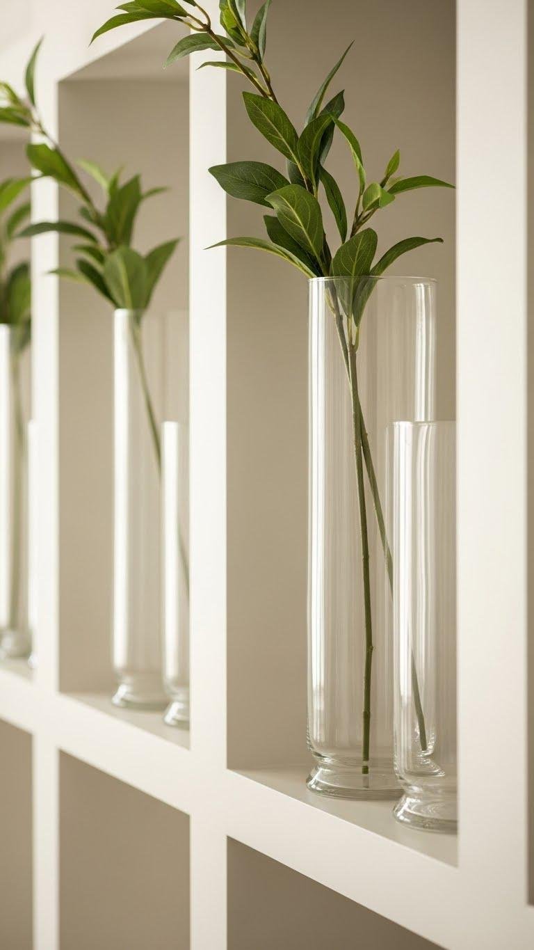 Bring a calm, curated look to your shelves by tucking tall hurricane vases filled with Amazon stems into open spots— they give height without fuss and read clean from across the room. Choose clear glass cylinders for a minimalist vibe and pair with realistic silk stems for low-maintenance greenery.
