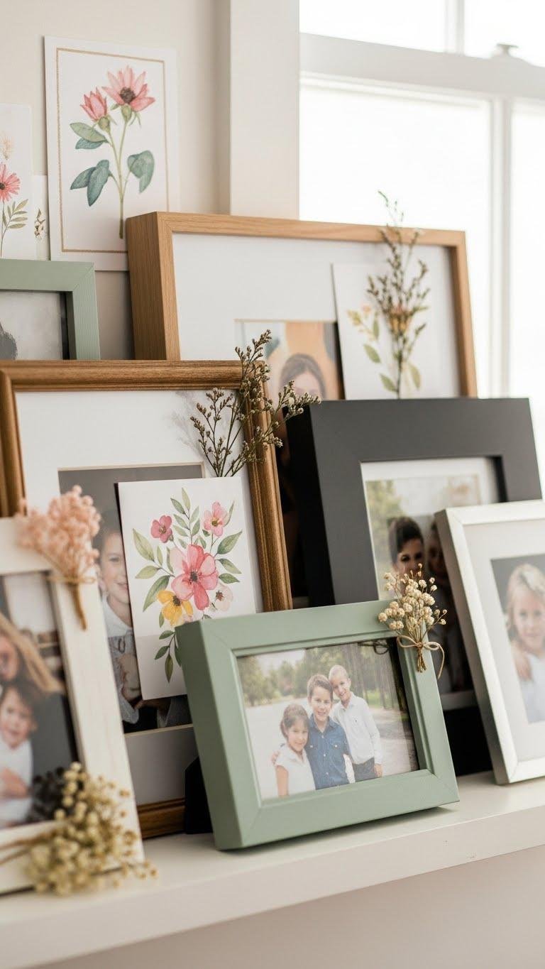 Layer family photos with a few delicate floral accents from Etsy to make your shelf feel lived-in and on-trend without looking staged. You’ll mix vintage frames and modern pieces, using Etsy layering to tuck tiny dried posies or watercolor sprigs behind corners.