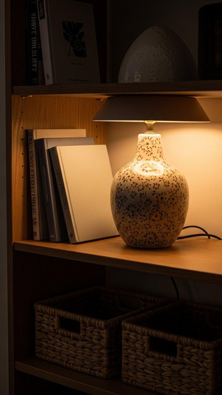 Set a ceramic lamp with a subtle floral pattern on an end of your shelf to introduce a soft, warming glow that instantly makes the vignette feel intentional and cozy. You’ll love the ceramic pairing with matte books or wicker; choose pattern placement to balance scale and color. Keep cords tidy, dim the bulb, and let that gentle light invite relaxed, unforced freedom into the space.