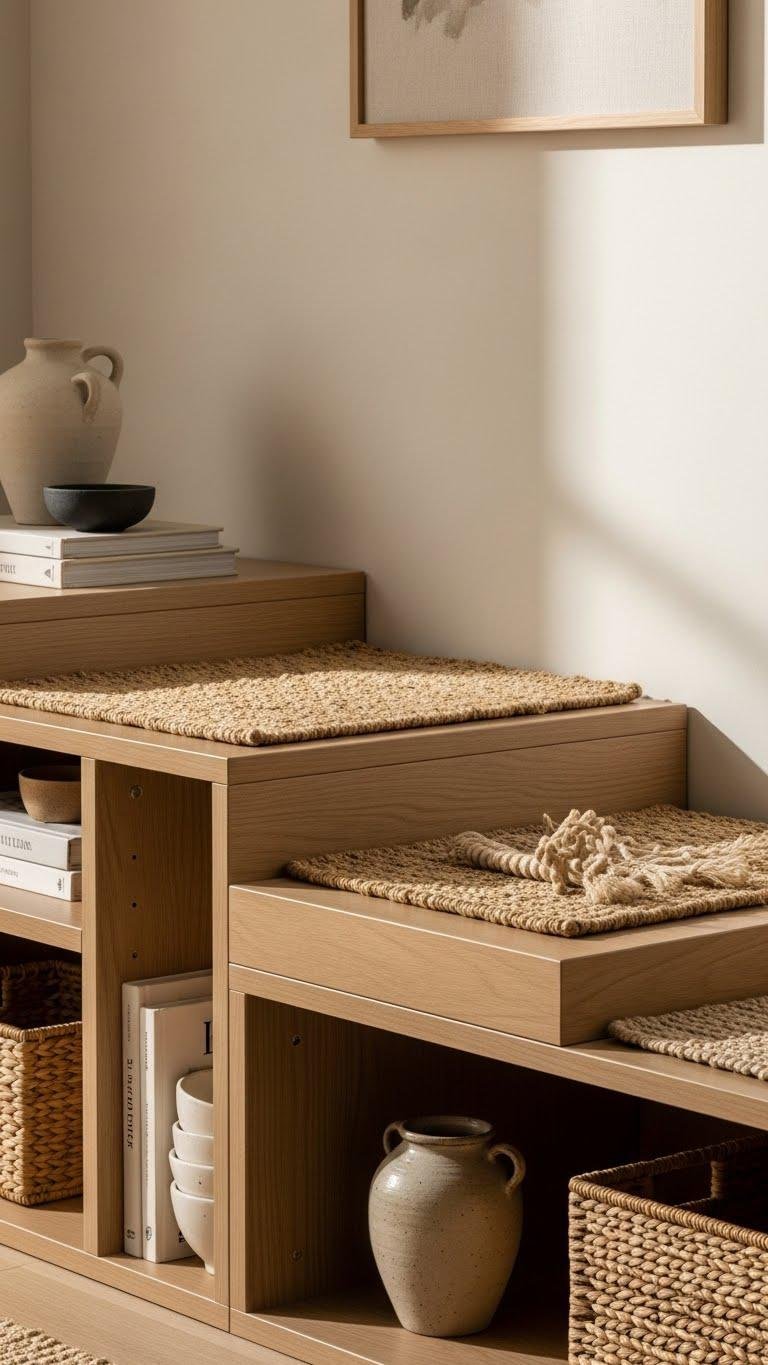 By layering small jute rugs and low wooden risers on your lower shelves, you’ll add warmth, height, and a calm, collected rhythm to the lower visual plane of the room.