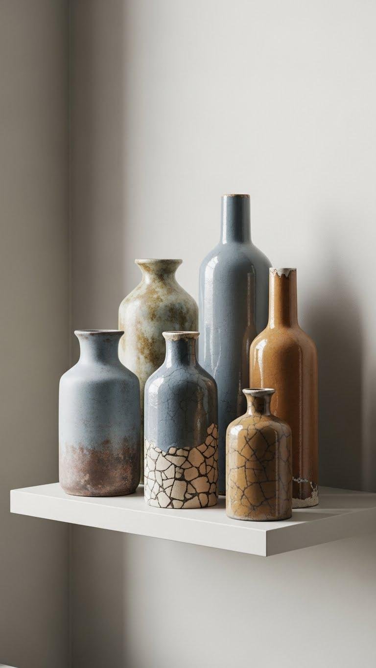 Pick three or five distressed vases and group them off-center to make an instant focal point that feels intentional, not forced. You’ll embrace asymmetrical grouping, letting varied heights and finishes create rhythm. Mix matte patina with glossy chips for bold textural contrast. Keep surrounding shelves airy, spare accessories, and let that imperfect cluster signal relaxed confidence and the freedom to break strict symmetry.