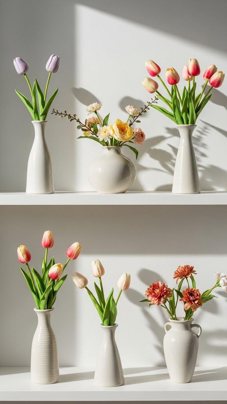 Bring in faux tulips and seasonal blooms to freshen a shelf without worrying about wilting petals—choose stems with realistic textures and subtle color variation so they read as natural at a glance.