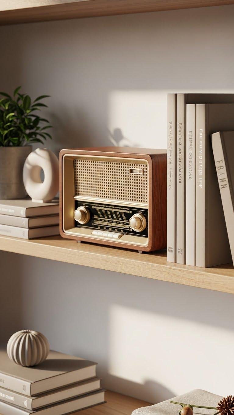 Pair a vintage radio with a stack of faux books to give your shelf an instant dash of nostalgia and polished restraint. You’ll balance texture and tone by mixing warm wood or brass radios with clean, neutral faux bookshelves spines.