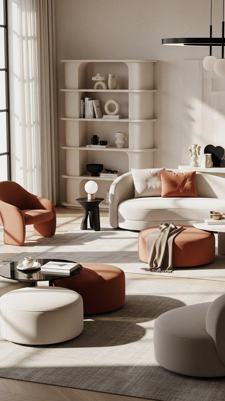 Softening a room with curved furniture immediately breaks up harsh angles and makes spaces feel more inviting. You’ll choose rounded ottomans to create relaxed seating clusters and layer them with slim, sculptural sofas. Pair curvilinear shelving to display objects without rigid lines, letting light and movement breathe. These choices feel luxe yet liberating, giving you freedom to live without constraints while staying impeccably stylish.