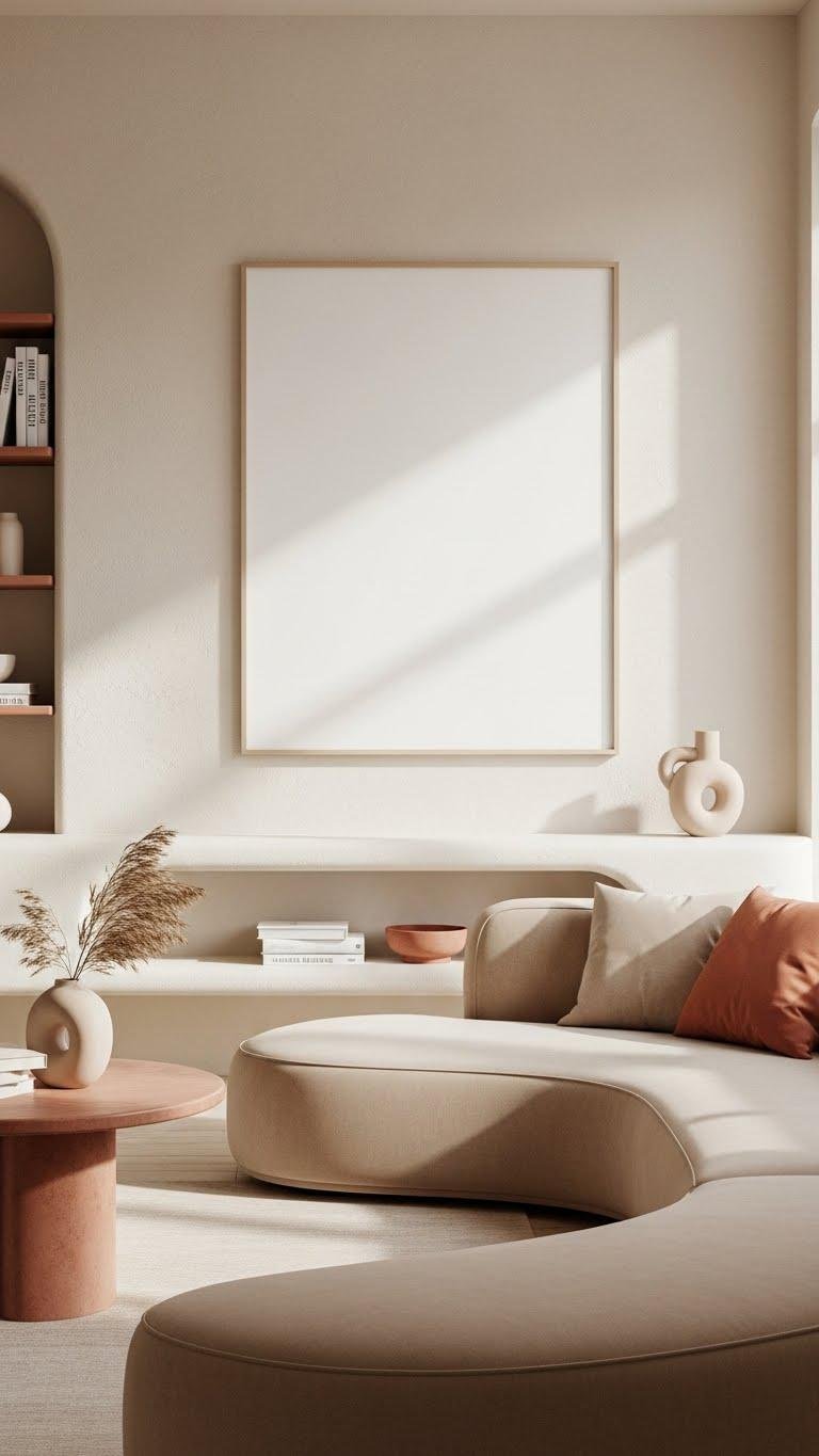 After you’ve softened a room with rounded seating and flowing shelving, bring in oversized art to anchor the space with confident scale and personality. You’ll choose a gallery scale statement canvas with oversized framing and a subtle matte finish to avoid glare. Place it deliberately, balance negative space, and let bold proportion and pared-back surroundings create a liberating, intentional focal point.