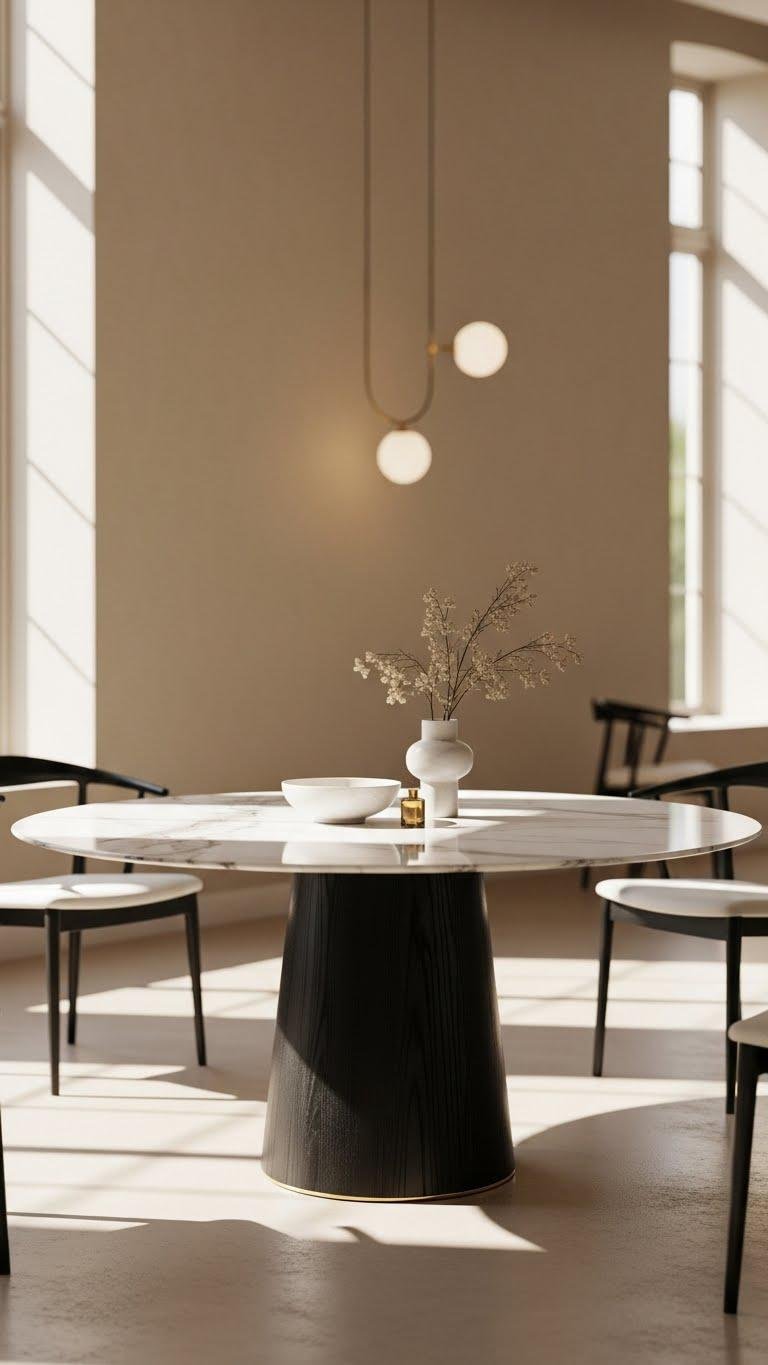 Circular tables are a smart way to soften a room’s geometry while improving flow and conversation; their curved edges invite movement and make tight layouts feel more open. You’ll choose a round pedestal base for airy balance, then pair it with marble tops for luxe contrast. This combo feels modern and liberated, letting you arrange seating freely while keeping a refined, uncluttered look.
