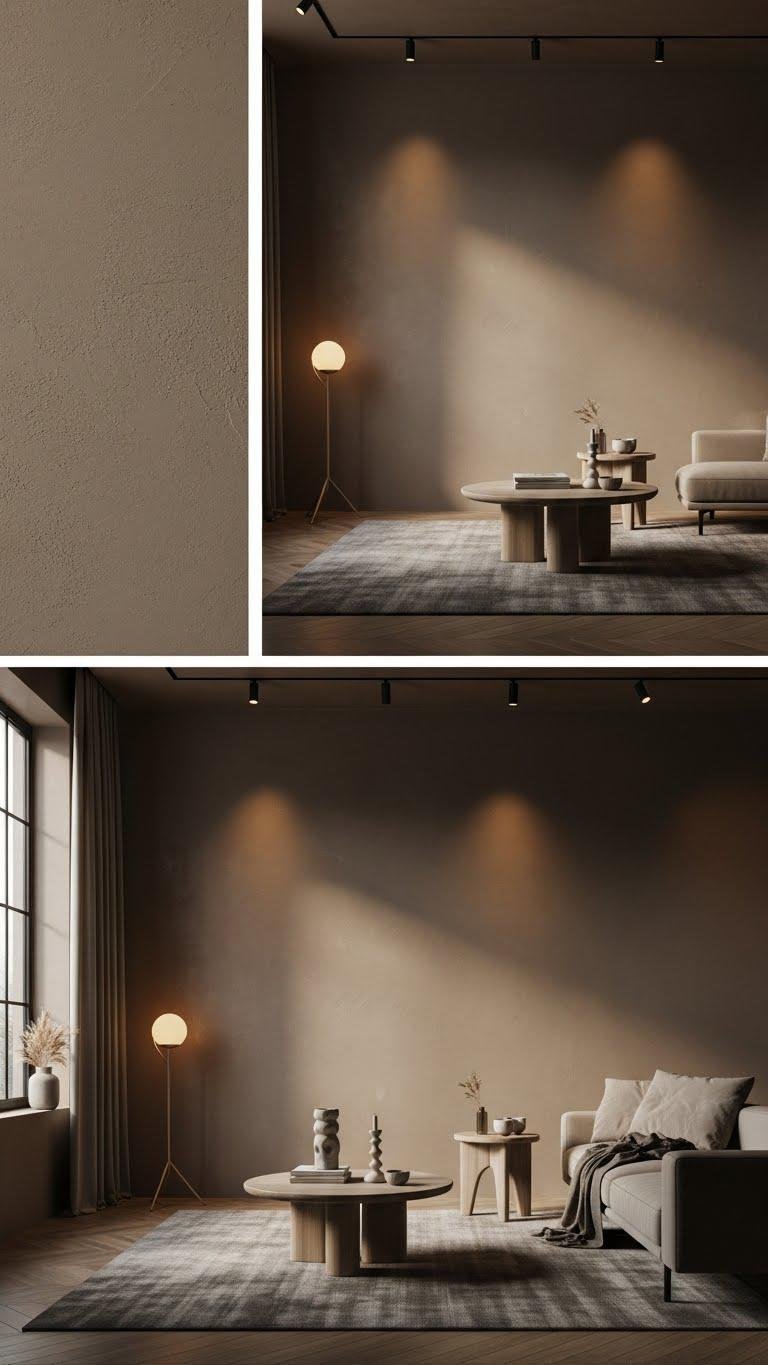Choose velvety plaster in matte taupe to add subtle texture and light modulation. You’ll elevate minimal pieces, define zones, and keep a liberated, layered look—refined, modern, and effortlessly intentional.