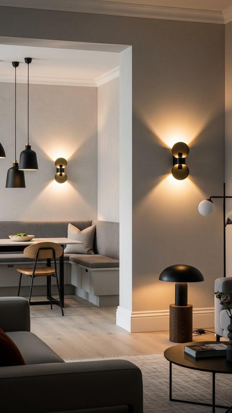 You’ll choose matte pendants for tactile sophistication, layered sconces for mood, and sculptural floor lamps that free movement. Install integrated dimmers so ambiance adapts instantly.