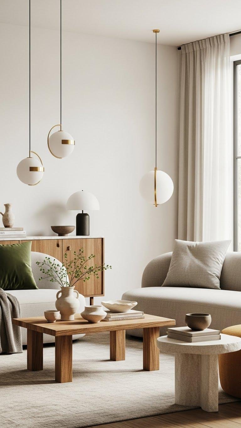 You’ll choose pieces like handcrafted ceramics and sculptural lighting, pair curved sofas with recycled teak tables, and favor matte metals and soft stone.